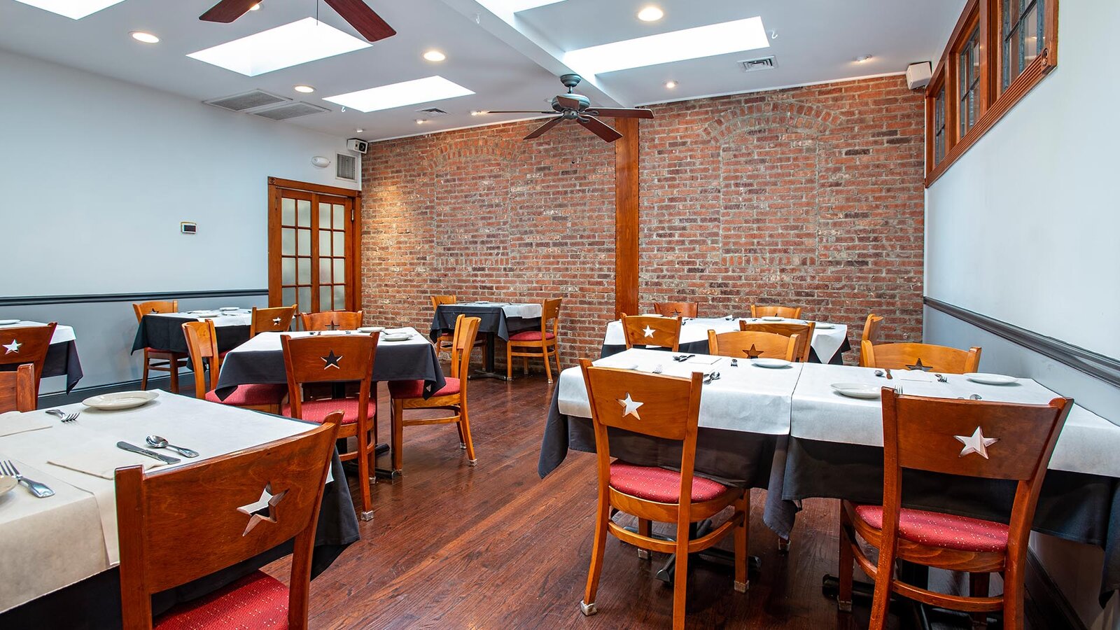 Multiple appetizers with a basket of bread accompanied with white and red wine